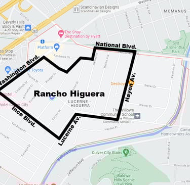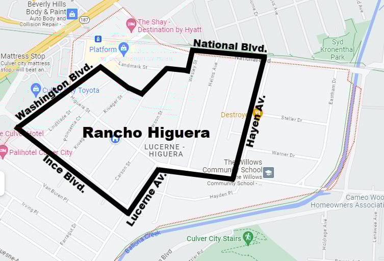 Rancho Higuera is Located between Washington Blvd., National Blvd., Lucerne Av., Ince Blvd., and Hayden Tract.